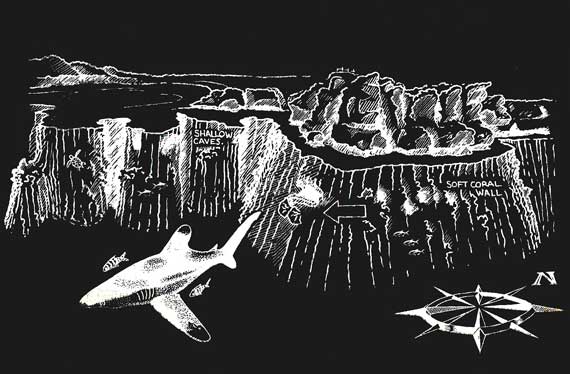 In spite of its name Shark Observatory is not noted for sharks. Nevertheless it is still a marvellous dive. Beneath the surface the towering cliffs continue at much the same angle to eventually fade into the deep blue beneath. This place defines the term blue water. The wall is smothered, especially at its northern end, in all colours of soft corals. In the shallow water are numerous small caves, gullies and canyons. These host colonies of glassfish and hatchetfish which constantly sweep and turn, herded by groups of lionfish. Beneath them scorpionfish sometimes lie in wait. On the corner at 10 m a large overhang is fringed with gorgonians. Here you can hide and watch groups of bluefin and giant trevallies cruising through. Even sailfish have been seen here. At the south end, close to Anemone City turtles are often seen. The colours are brighter in the morning with the sun on the wall. Many people prefer an afternoon dive. At this time of day the reef is dark, moody and mysterious. To dive Shark Observatory from a boat jump in at the north end beneath the more northerly of the two sets of clifftop railings. Put your right shoulder to the reef and head south. In the afternoon a strong current will often help you along. Once you have rounded the corner this will abate. A counter current often develops in this bay. It may slow your progress but is rarely a problem. Alternatively jump in at Anemone City and ride this counter current northwards towards the Observatory. Shark Observatory can be shore dived. Park at the Shark Observatory carpark and snorkel across the lagoon to the dive site. Alternatively take a left just before the carpark and park in the small cove beneath the Observatory cliffs.