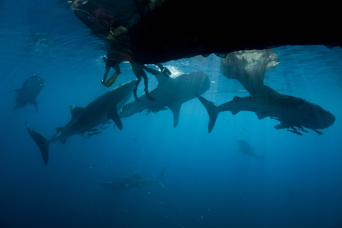 Those whalesharks are not fed because of tourism or hunting! Local Fishermen throw fish in the water to attract bigger fish like tuna. The whalesharks are attracted as well. The fishermen actually believe that they bring luck for more and better fish. They are not harmed or caught! But anybody understands that nobody could just stay on top of the ship looking at that, you gotta be in there :)