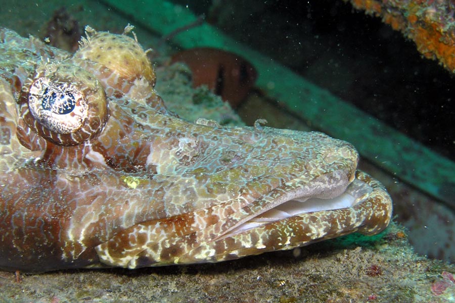 Marble rays, blue-spotted rays and whitetip sharks live under the bow and eagle rays and devil rays sometimes pass through. The wreck is covered in a healthy growth of soft coral, and the resident fish grow to a large size. Several varieties of sweetlips grow bigger here than at any of our other dive sites and the juveniles are often seen. Large cuttlefish and scorpionfish are common as well as nudibranchs and flatworms. A giant moray eel is living in the wreck. You can also see many of the beautiful purple fire sea urchins, accompanied by their resident zebra crabs and Coleman\\\\´s shrimp. Penetration is possible for qualified divers. There is lots to see inside as it has remained unsalvaged.