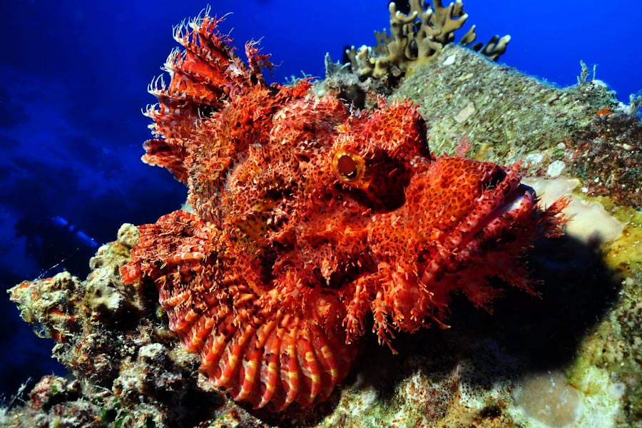 The Cave 10m / 35ft - Or more accurately, The Tunnel. Journey underneath Gato Island and come out the other side! This 30m tunnel houses all the usual cave dwellers: many types of crab big and small, lobsters and cardinal fish. You should also encounter some large puffer fish and perhaps bamboo and cat sharks.