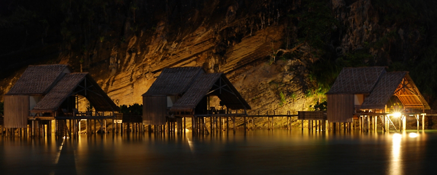Misool features eight rustically luxurious Water Cottages which are are located in the North Lagoon, just steps from the Dive Centre and restaurant. The Water Cottages are built on stilts over the water. For lazy afternoons with a good book, there is a hammock built right into the veranda. The view from your veranda is framed by a traditional grass roof, offering a high degree of privacy as well as shade. Stairs lead down from your veranda to the North Lagoon, and the House Reef is just a few fin kicks away.