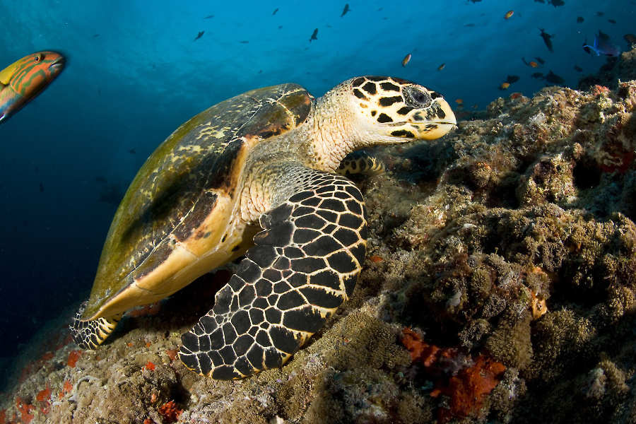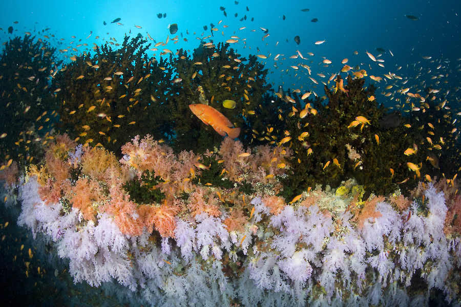 In the channels, where soft coral proliferates with a profusion of colourful sponges, invertebrates and gorgonian fans are all profiting from the nutrient-rich water. There are also plenty of cleaning stations where cleaner wrasses and shrimps service the larger marine species.