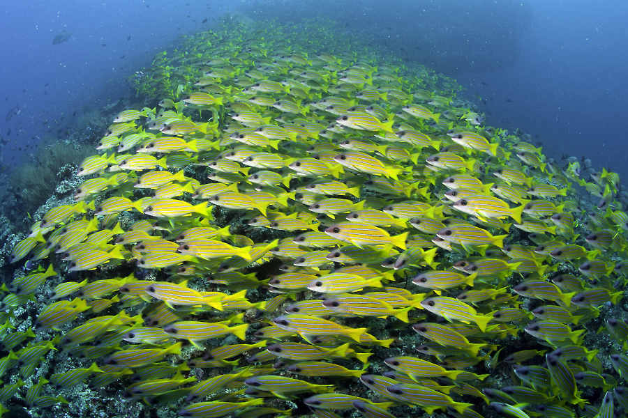 Sweeping through a myriad of channels and passages between the atolls, the ever-present current ensures that nutrients are always on the move throughout the island chain. This accounts for the vast numbers of fish feeding on the passing feast and you can expect to see Napoleon wrasse, parrotfish, snappers, barracudas, jacks and sweetlips in every site where the water flows.