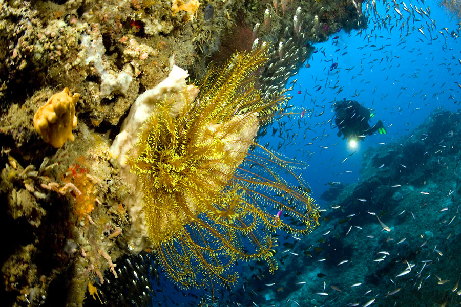 Divers will find probably the largest variety of marine life on our planet in the Philippine Sea. Many rare sea creatures, like colourful nudibranchs and seahorses can be found on beautiful rich reefs. Turtles, sea snakes and a variety of schooling fish are regularly encountered. Wreck fans will find paradise in Coron Bay, where they have a World War II ship graveyard. Pelagic fish are more likely to be found near the island of Malapascua, on Apo Reef and Tubbataha Reef as well as in South Leyte.