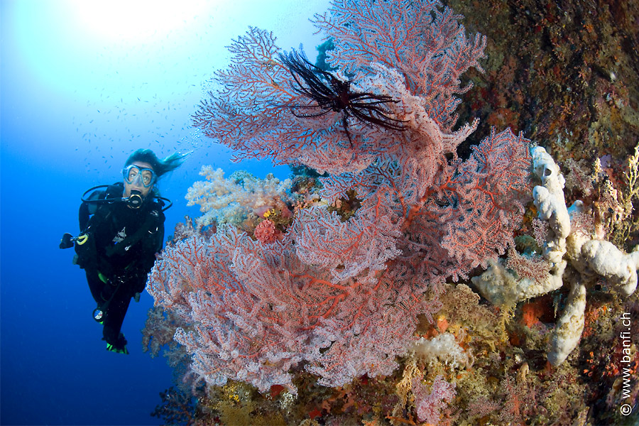The beautiful underwater scenery is made up of sea fans, soft corals and feather stars. Many colourful nudibranchs, frog fish, snake eels, lungfish and sea snakes have made this their home. With a little luck larger animals can be seen from February to April.