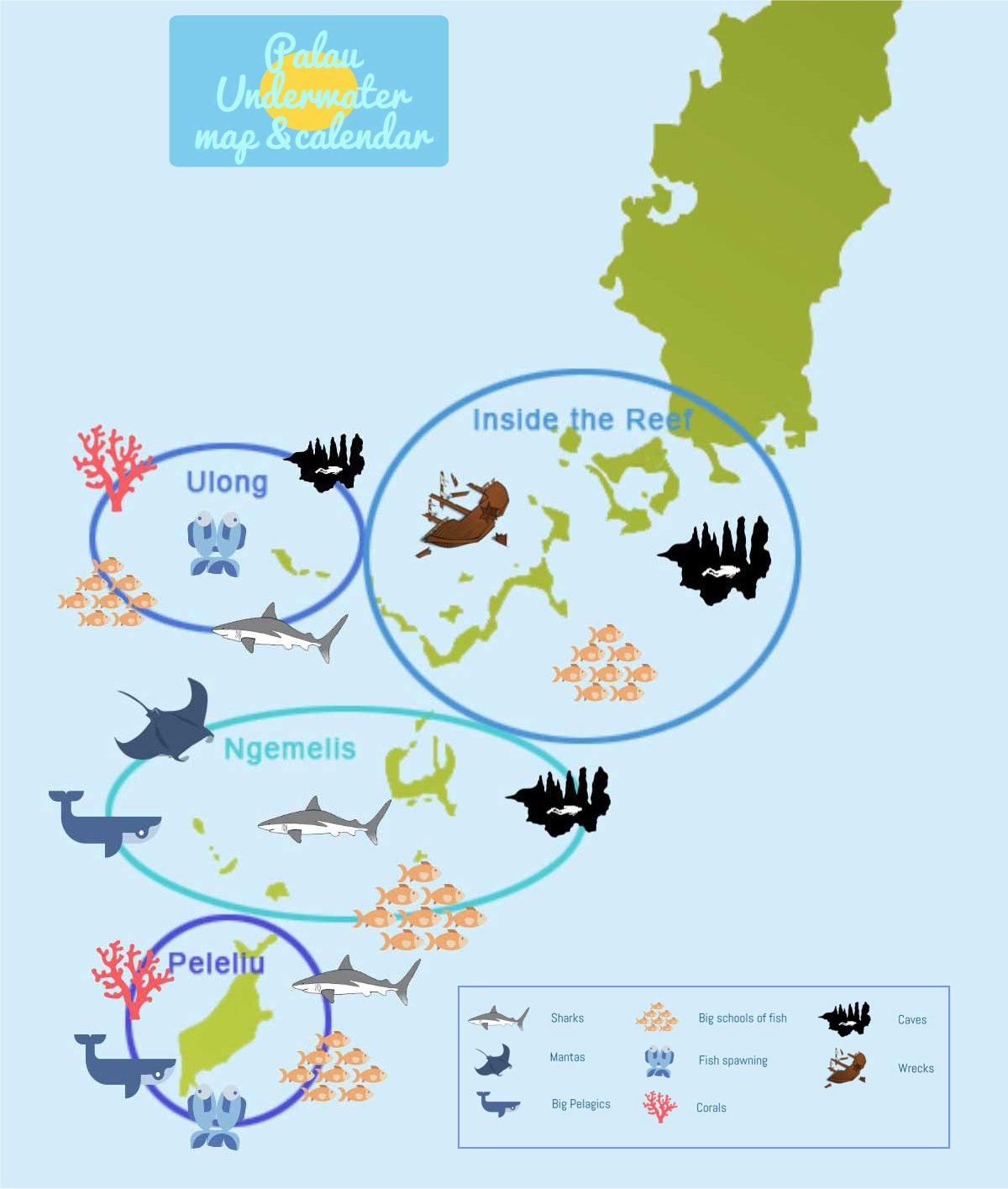 Peleliu: The island of Peleliu, at the southern tip of the main archipelago of Palau, is bordered by magnificent walls. The dive sites include Peleliu Corner, Yellow Wall, and Orange Beach, among others. Peleliu dive sites are mainly steep walls covered with sea fans, sea whips, hard corals and anemones, but dominated by soft corals. Peleliu is an excellent place to observe large pelagic life, particularly sharks.