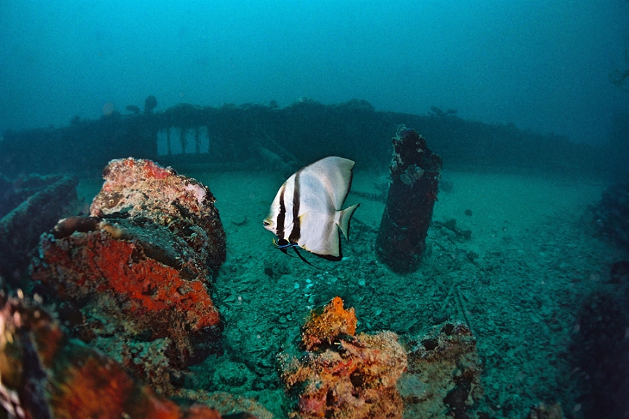 Wreck of the Iro Maru: A 145' long merchant ship sunk during World War II by American bombers, the Iro Maru sits upright in 120' of water just 10 minutes south of Koror. Three mast and gun turrets at the bow and stern support a large variety of invertebrates and hard corals. The main deck is at a depth of 80'with open holds containing oil drums and machinery.